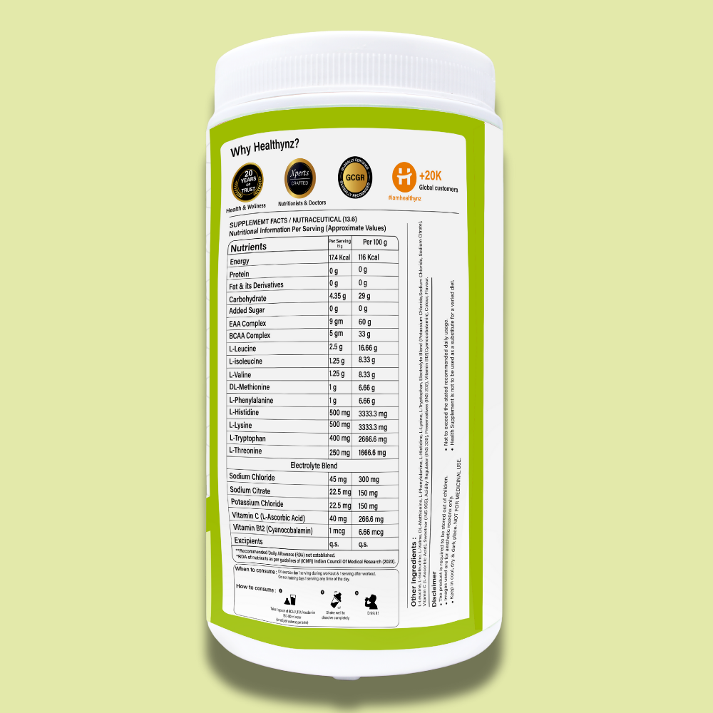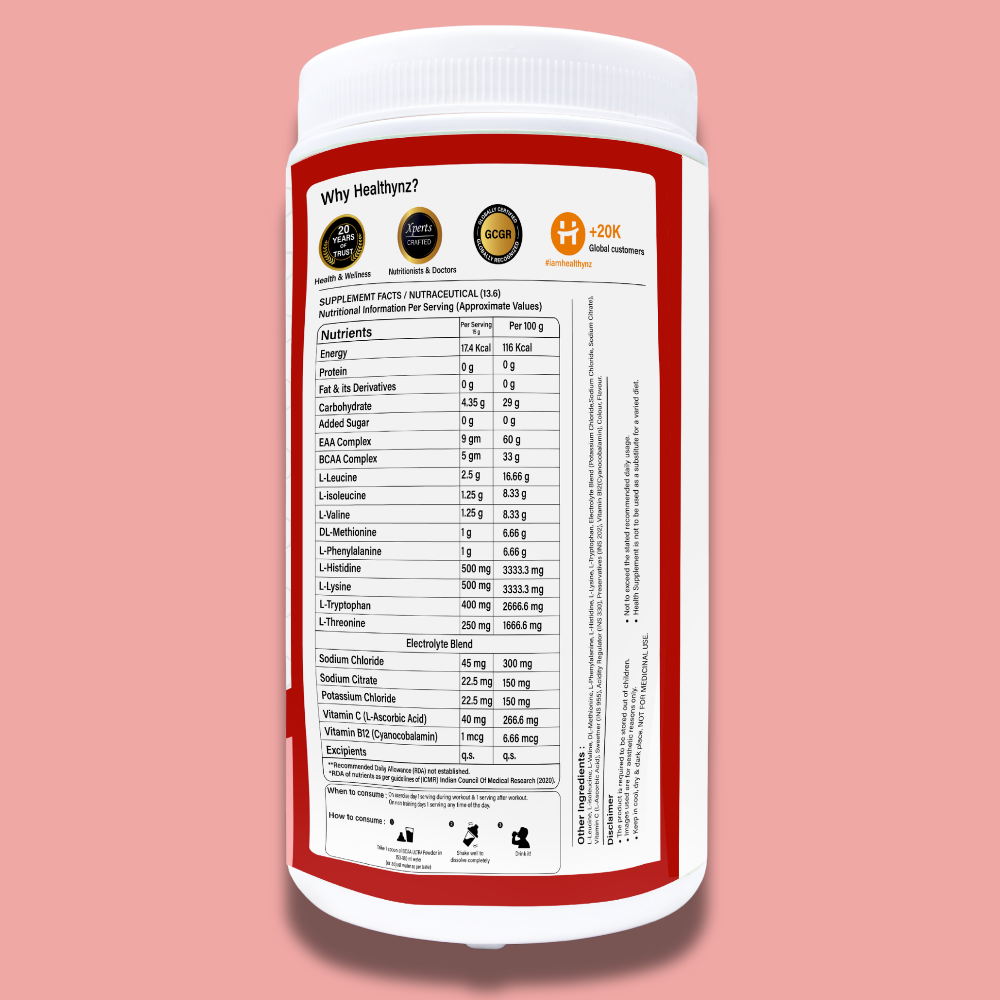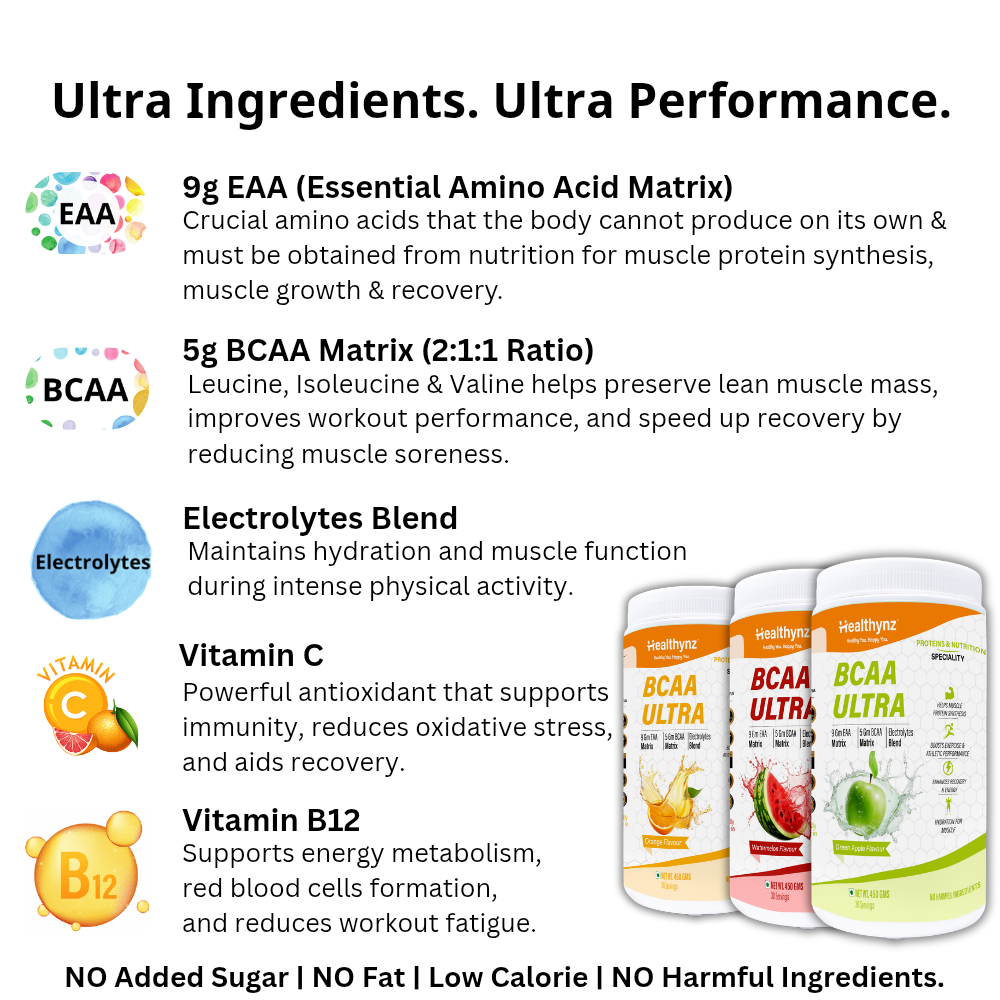 A. Healthynz BCAA Ultra contains a complete 9 g EAA matrix, 5 g BCAA (2:1:1), electrolytes, Vitamin C, and Vitamin B12, providing muscle recovery, hydration, and performance support in one clean formula.